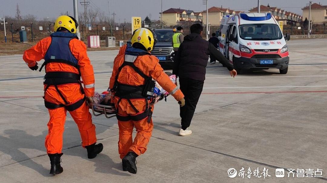 准备就绪后,救助直升机“B-72FZ”从蓬莱机场起飞,直飞救助区。抵达现场后,绞车手利用绞车下放救生员,通过吊运的方式将心梗船员和一名陪同转移至机舱,随后迅速返回。最后,直升机在威海机场落地,将心梗船员转交当地医院,进行后续治疗。