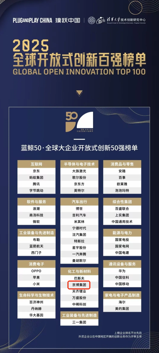 论坛期间,备受关注的“2025全球开放式创新百强榜单”正式揭晓,京博控股集团凭借其在开放式创新方面的系统实践,入选“蓝鲸50・全球大企业开放式创新50强”,成为化工行业在这一全球性评选中获得认可的代表性企业之一。