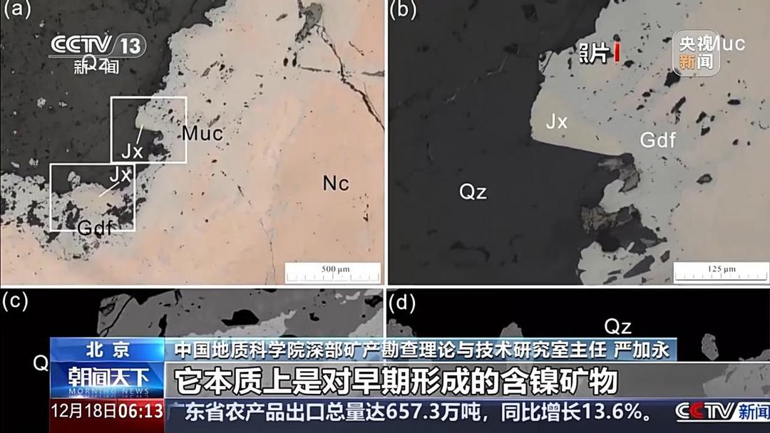 中国地质科学院深部矿产勘查理论与技术研究室主任 严加永:金秀矿的化学式是镍、铋、硫、锑、砷,它本质上是对早期形成的含镍矿物进行置换,导致了晶体结构重新排列,从而结晶出了一种全新的结构稳定的矿物。