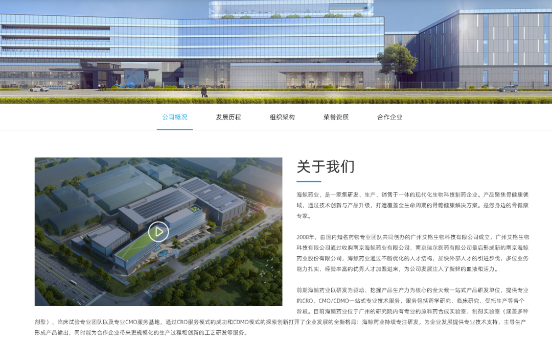 海鲸药业,是一家集研发、生产、销售于一体的现代化生物科技制药企业。2008年,由国内知名药物专业团队共同创办的广州艾格生物科技有限公司成立,广州艾格生物科技有限公司通过收购南京海鲸药业有限公司、南京瑞尔医药有限公司最后形成新的南京海鲸药业股份有限公司。
