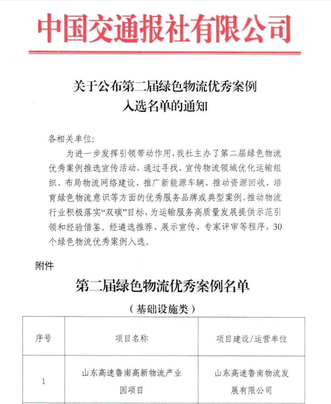 山东高速鲁南高新物流产业园入选第二届绿色物流优秀案例名单