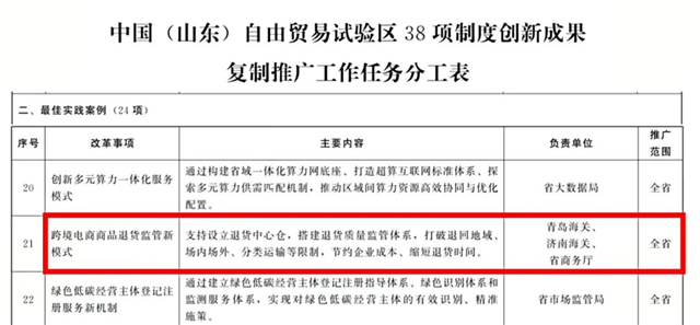 近日,记者从临港区商务局获悉,山东省人民政府发布《关于做好中国(山东)自由贸易试验区38项制度创新成果复制推广工作的通知》,临港区探索推出的跨境电商商品退货监管新模式获评最佳实践案例。
