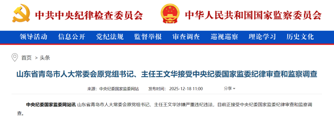 据中央纪委国家监委网站12月18日消息山东省青岛市人大常委会原党组书记主任王文华涉嫌严重违纪违法目前正接受中央纪委国家监委纪律审查和监察调查