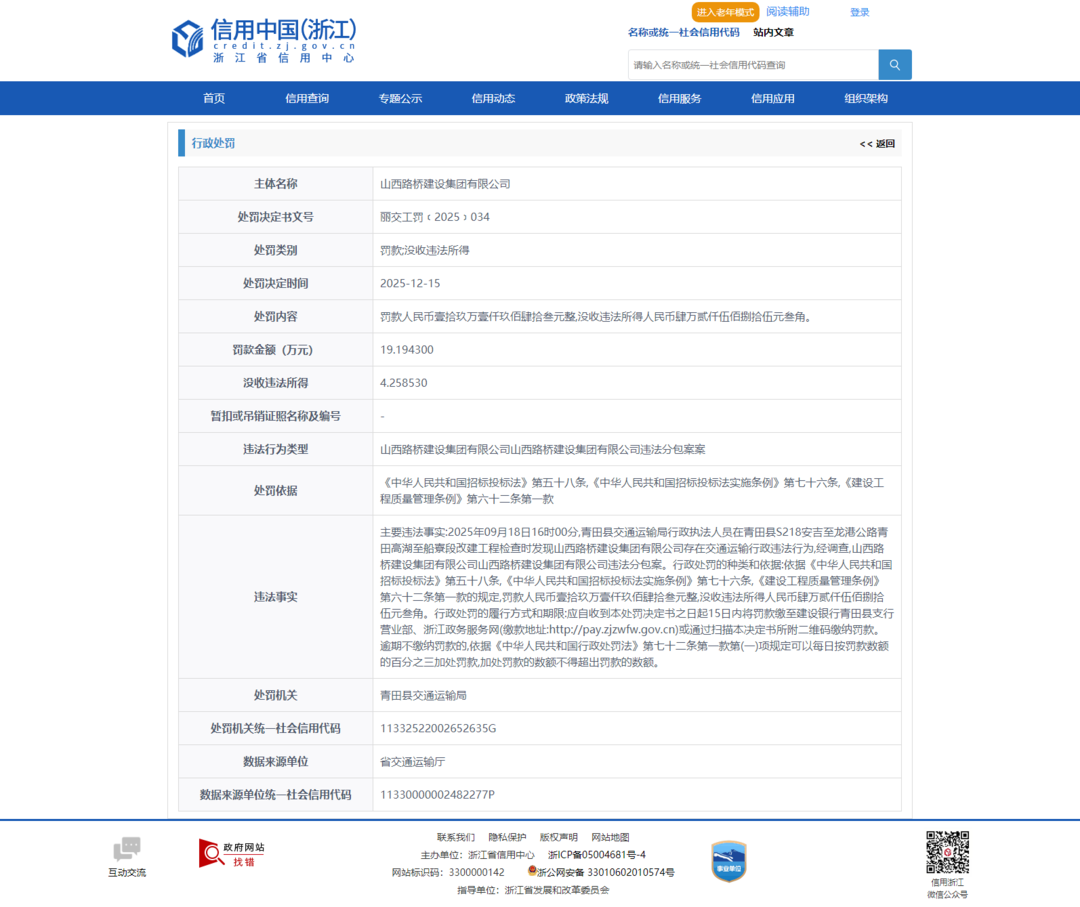 依据《中华人民共和国招标投标法》第五十八条、《中华人民共和国招标投标法实施条例》第七十六条及《建设工程质量管理条例》第六十二条第一款的规定,青田县交通运输局于2025年12月15日作出处罚决定:对山西路桥建设集团有限公司处以罚款人民币191943元,并没收违法所得人民币42585.3元。
