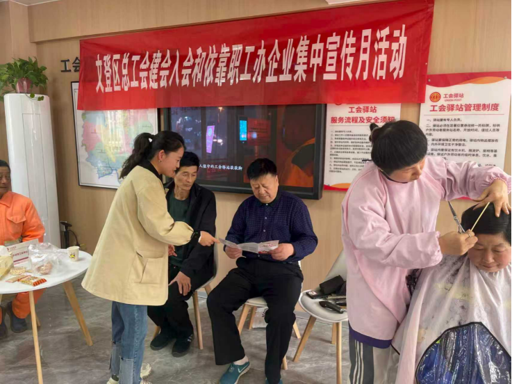 走进文登区政务服务中心大厅,巨型LED屏循环播放着《企业成立工会的好处》动画短片,用生动案例和通俗语言解读政策红利;城区的公交车化身“流动宣传站”,车内海报全方位展示工会为职工提供的贴心服务;商圈、招聘会、工会驿站内,“扫码入会”“义剪+宣传”等特色服务,让建会入会工作既有温度又有力度……