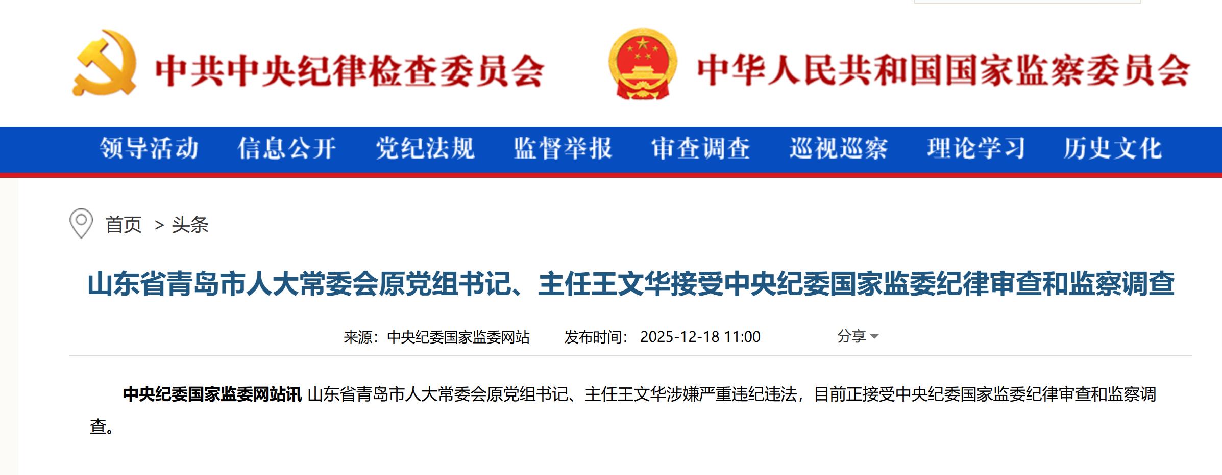 12月18日中央纪委国家监委网站通报山东省青岛市人大常委会原党组书记主任王文华涉嫌严重违纪违法目前正接受中央纪委国家监委纪律审查和监察调查