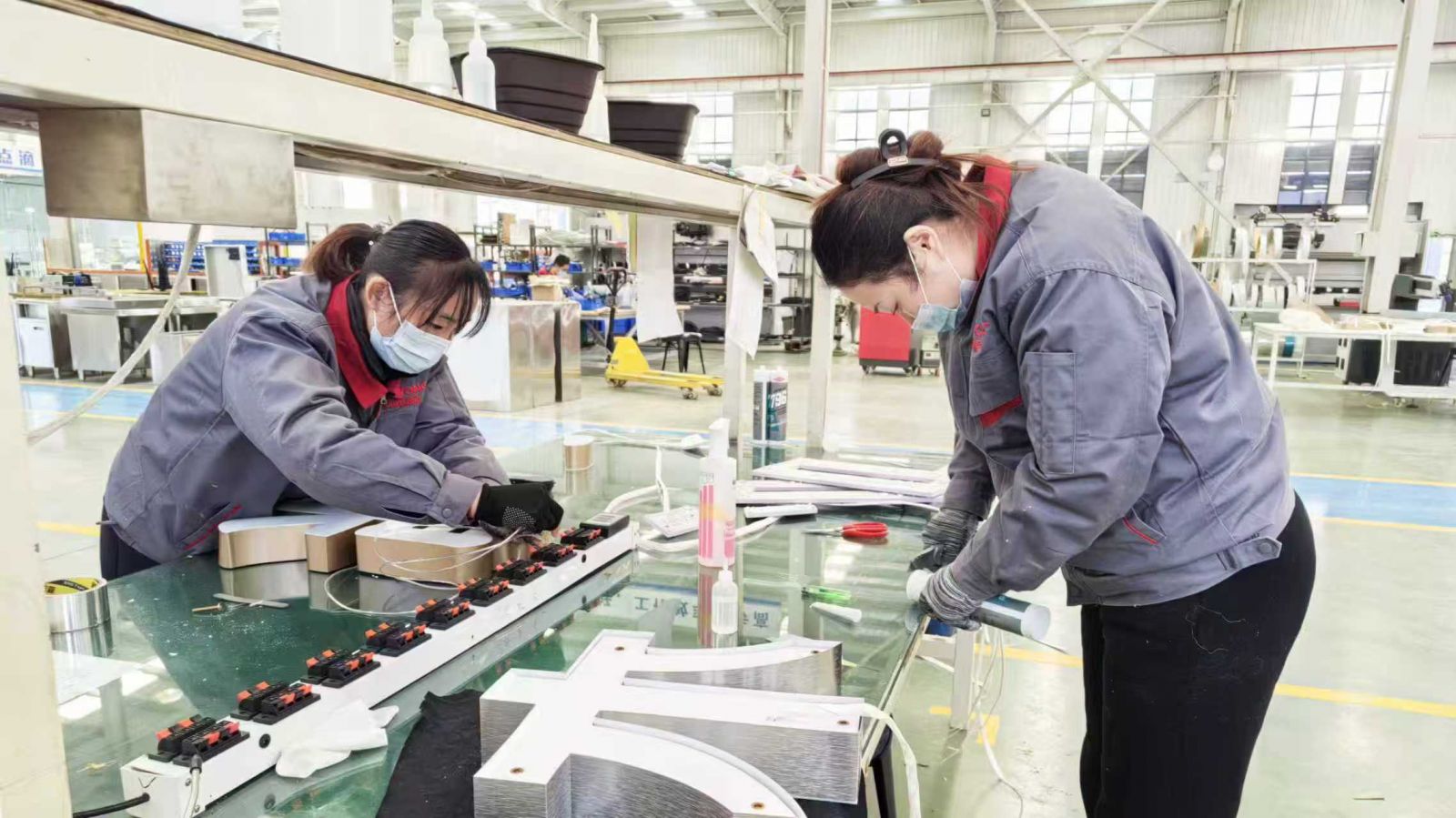 这些为顾客带来美好体验的装饰画、菜单屏、标识等,均出自当地一家工厂——花哚牌标(山东)厨房设备有限公司。走进该公司的车间,映入眼帘的是一片繁忙:不锈钢卷材切割、货架钣金、发光字排灯、菜单屏打印、覆膜打包……工人们分工有序,正加紧赶制订单。