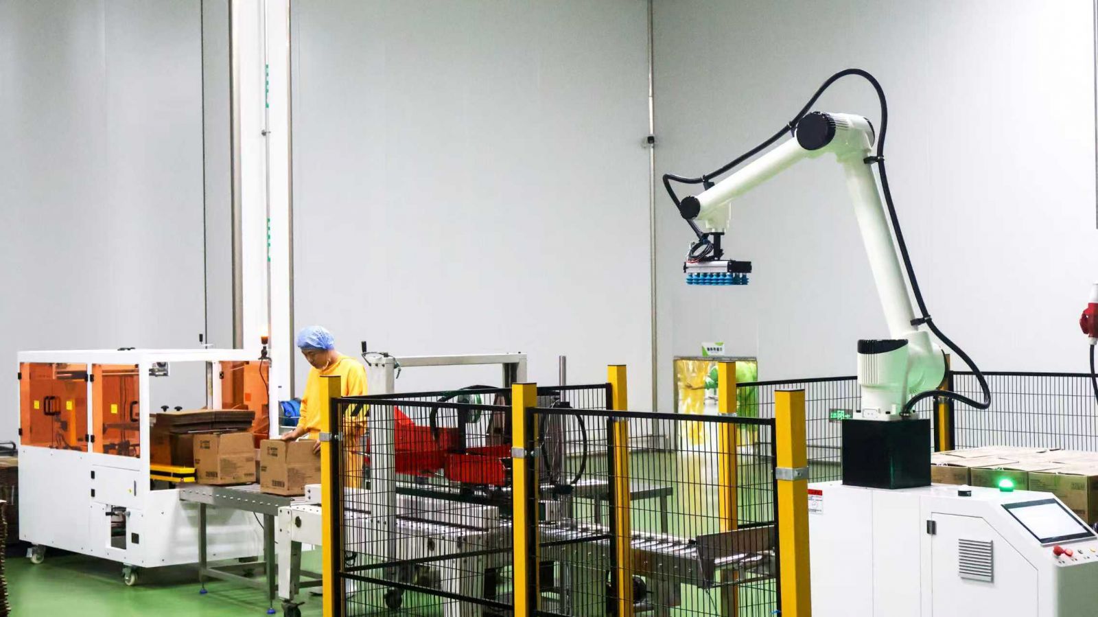 在山东花哚食品有限公司外包装车间,全自动生产线高速运转,从速冻隧道输送过来的肉制品连贯而出。通过机械抓手装箱,经封口、码垛等工序,一箱箱食品被整齐打包。