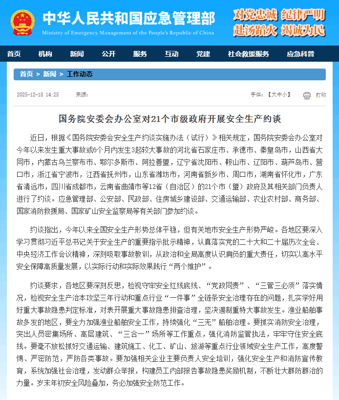 近日,根据《国务院安委会安全生产约谈实施办法(试行)》相关规定,国务院安委会办公室对今年以来发生重大事故或6个月内发生3起较大事故的河北省石家庄市、承德市、秦皇岛市,山西省大同市,内蒙古乌兰察布市、鄂尔多斯市、阿拉善盟,辽宁省沈阳市、鞍山市、辽阳市、葫芦岛市、营口市,浙江省宁波市,江西省抚州市,山东省潍坊市,河南省新乡市、周口市,湖南省怀化市,广东省清远市,四川省成都市,云南省曲靖市等12省(自治区)的21个市(盟)政府及其相关部门负责人进行了约谈。应急管理部、公安部、民政部、住房城乡建设部、交通运输部、农业农村部、商务部、国家消防救援局、国家矿山安全监察局等有关部门参加约谈。