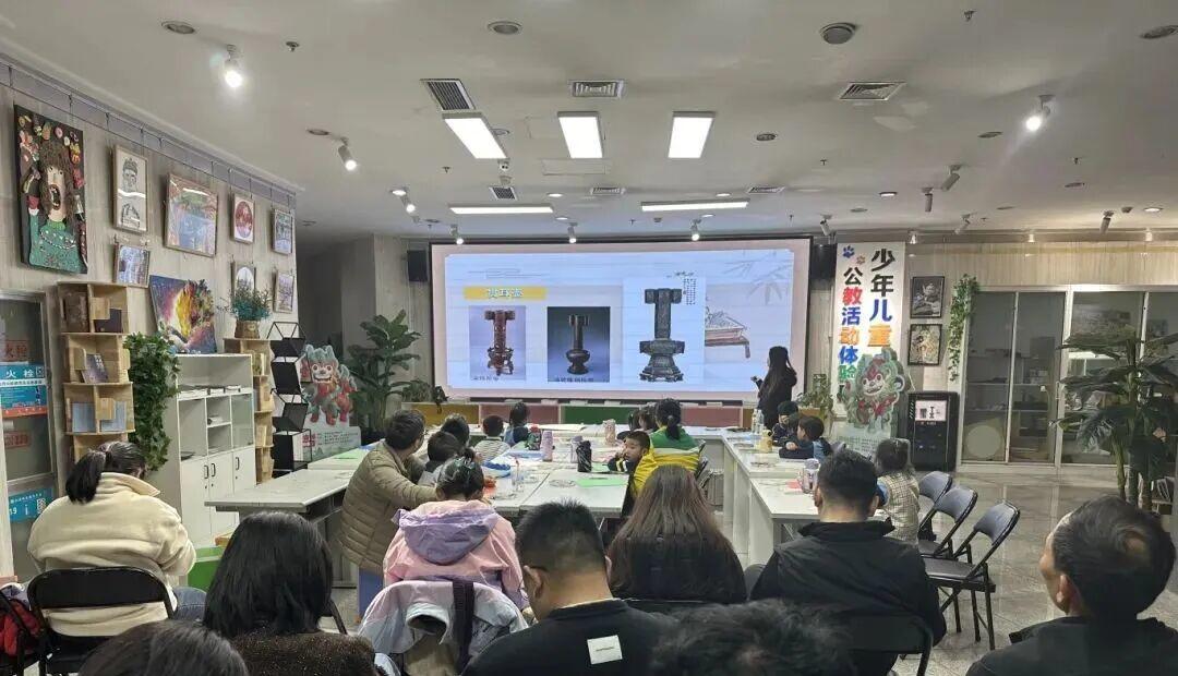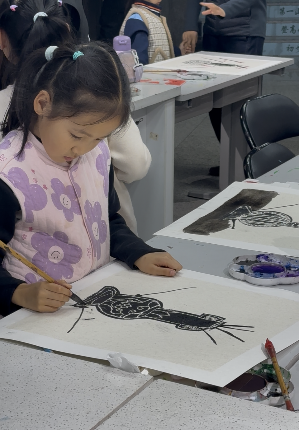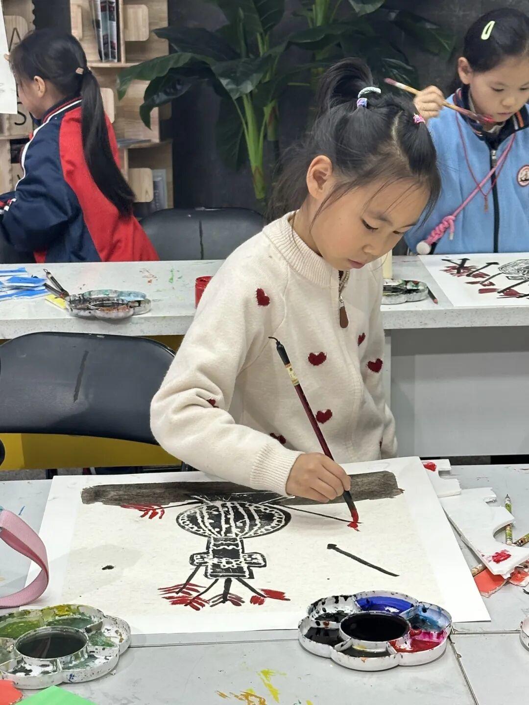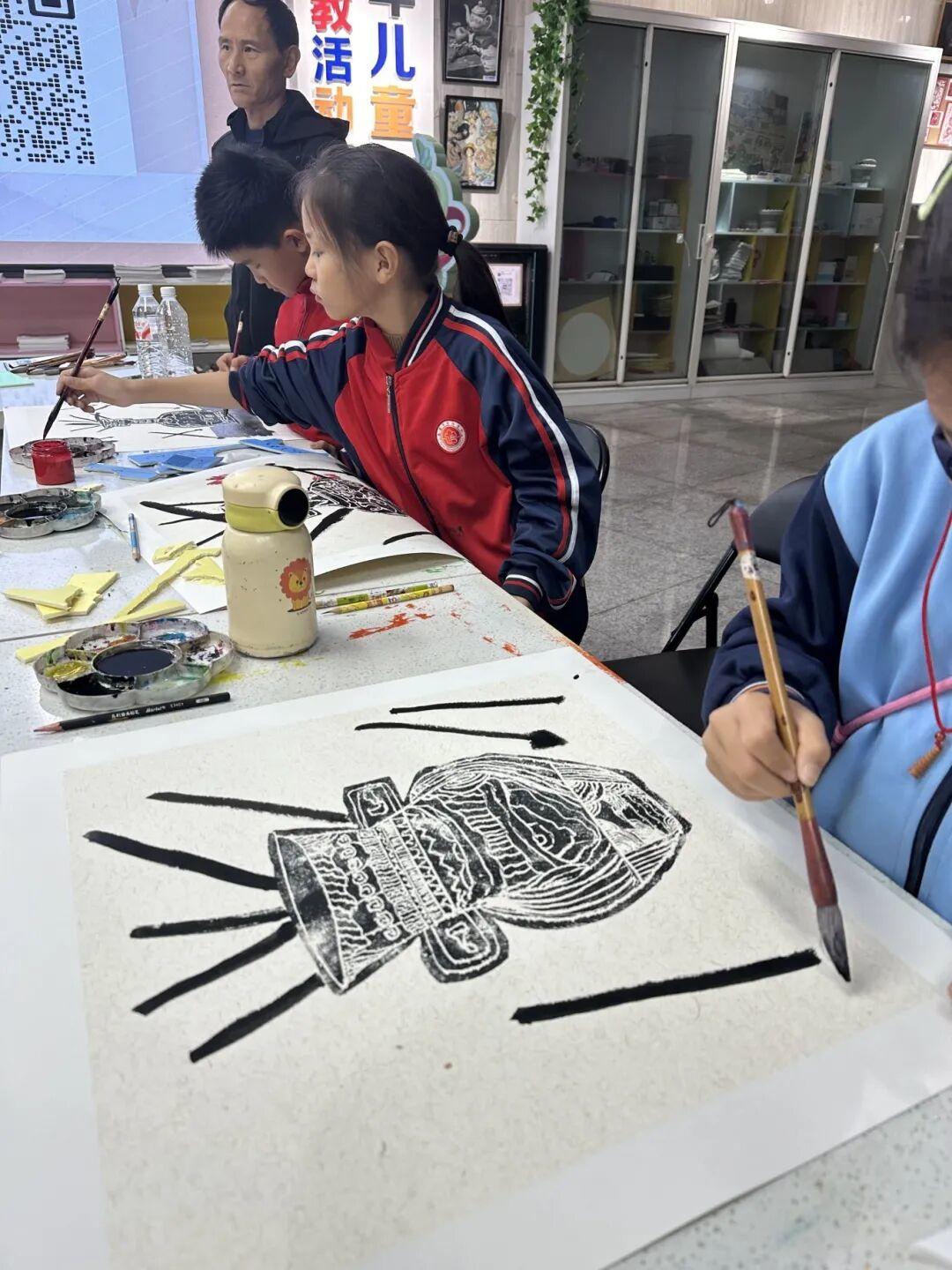 孩子们通过观察贯耳壶的造型与纹饰,亲手体验拓印技法,在拓与画之间感受青铜器的结构之美。活动中,他们专注投入,不仅锻炼了手眼协调能力,更在作品中融入了自己的想象,他们专注地安排箭矢方向,精心搭配纹样,在动手动脑间,既触摸到了历史的形状,也留下了自己独一无二的创作印记!