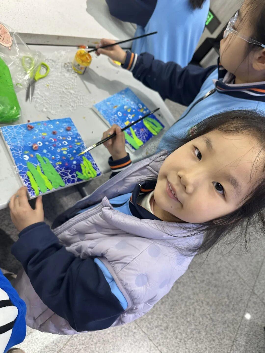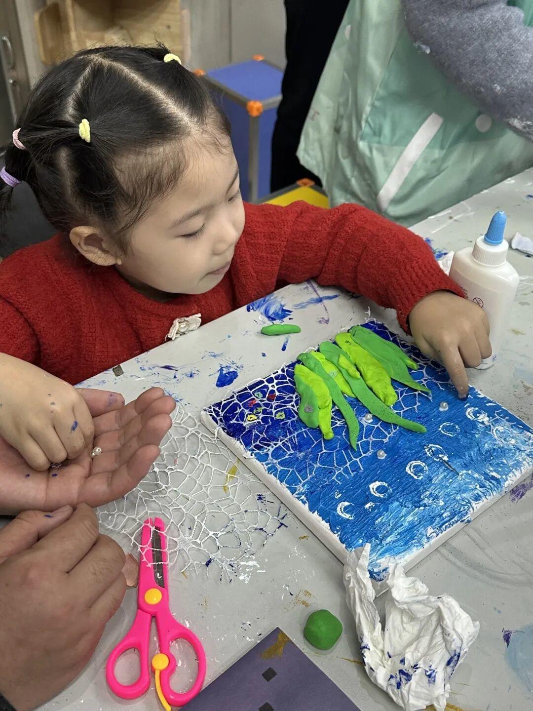 从铺染蔚蓝底色,到用网纱、彩纸和彩泥创造珊瑚、鱼群与水草,孩子们在合作与探索中建构出自己的海底梦境。他们热情分享自己对海洋的想象,画面层次丰富、色彩灵动,在动手实践中提升了材料运用与色彩搭配的能力。过程中笑声不断,每个人都创造出了自己那片最特别、最梦幻的海洋!