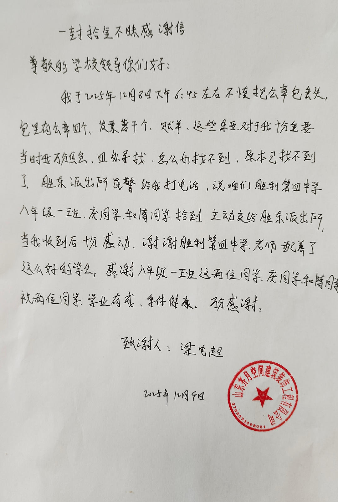 12月9日清晨,庞润博、隋朝旭在上学途中捡到了一个装有现金、公章、若干发票的钱包。考虑到失主焦急,他们迅速将钱包送往山东省滨海公安局滨东分局胜东派出所。民警通过钱包内的相关证件信息联系到了失主。失主取回失而复得的钱包后,欣喜不已,特意写了一封感谢信,赞扬两位同学的高尚品质,并肯定了学校在学生道德教育方面的成果。
