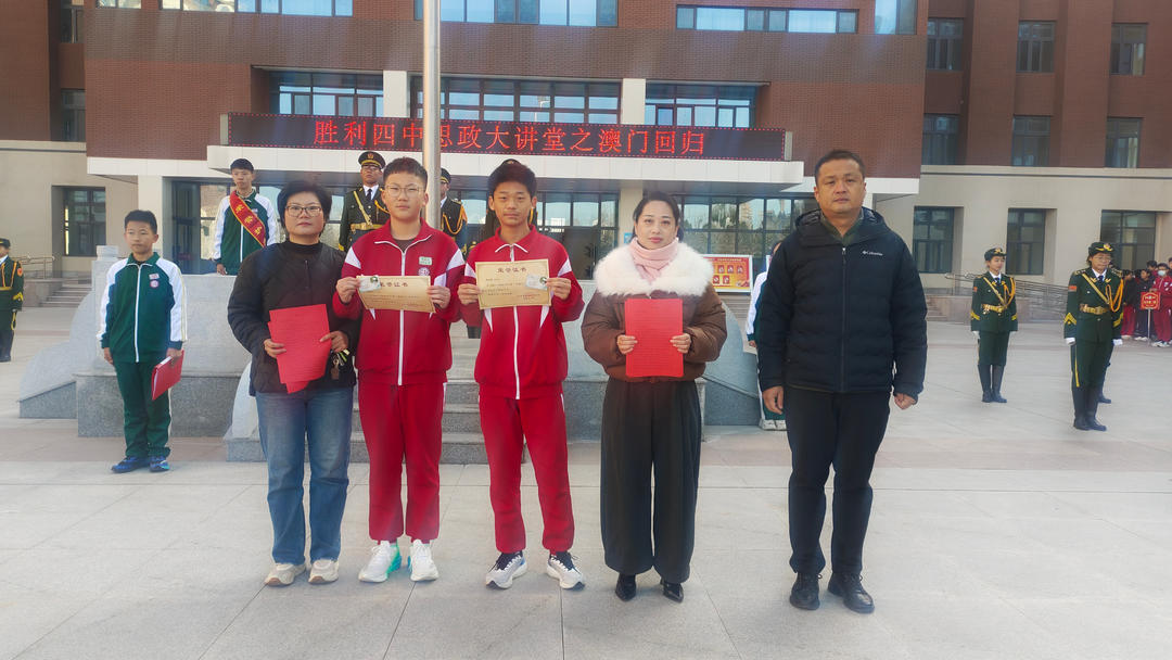 12月15日早上,东营市胜利第四中学升旗仪式上,八年级一班的庞润博、隋朝旭两位同学因拾金不昧行为获学校特别表彰,并获赠学校学生量化考核最高奖励——黄金卡。