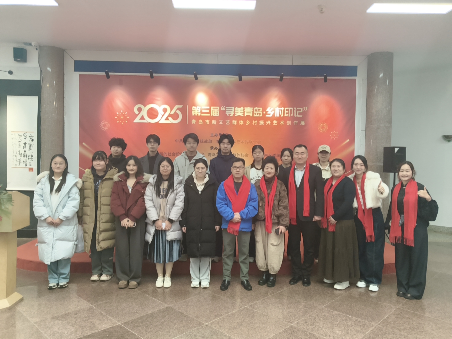 近日,由崂山区沙子口街道办事处、沙子口街道新时代文明实践所、青岛大学文学院、沙子口新联会联合开展的“观展学艺强素养 志愿赋能乡村兴”文明实践志愿者培训活动在青岛出版艺术馆顺利举行。街道组织辖区 20 名大学生志愿者走进第三届 “寻美青岛・乡村印记”青岛市新文艺群体乡村振兴艺术创作展,以 “观展研学 + 艺术交流” 的特色培训模式,深化志愿者对乡村文化的理解与传播能力,为践行乡村振兴战略注入青春力量。