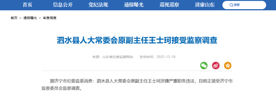 12月18日据济宁市纪委监委消息泗水县人大常委会原副主任王士珂涉嫌严重职务违法目前正接受济宁市监察委员会监察调查