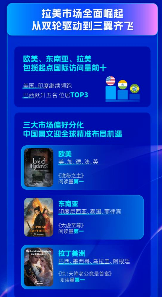 市场格局的深刻变化是今年最大亮点。本年度,拉丁美洲“现象级”崛起,其中巴西市场以月活779%的增速领跑,用户访问量跃升五位,和美国、印度包揽了全球前三。美国市场用户规模同比增长91%,接近翻倍。印度、法国、英国等市场也持续高速增长。一个真正世界性的、多极增长的全球网文市场已然形成。