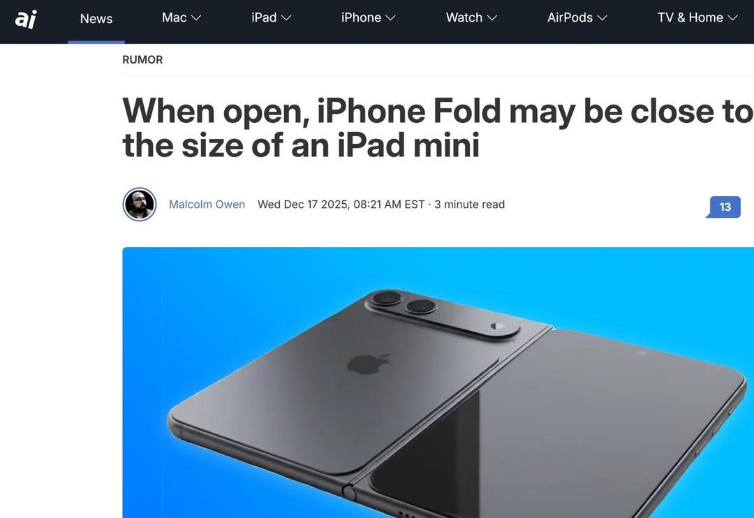苹果首款折叠屏手机展开尺寸逼近iPad mini,或成2026年最“宽”手机