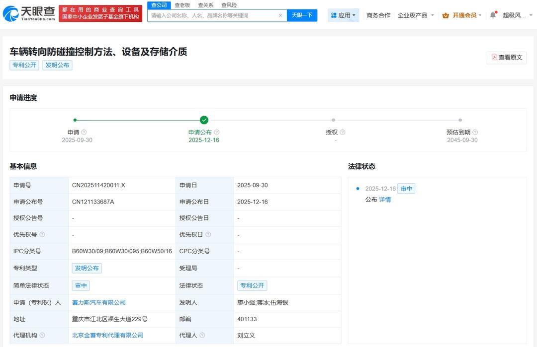 天眼查App显示,近日,赛力斯汽车有限公司申请的“车辆转向防碰撞控制方法、设备及存储介质”专利公布。