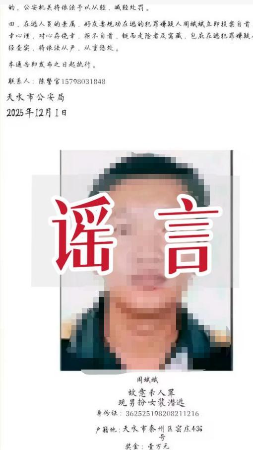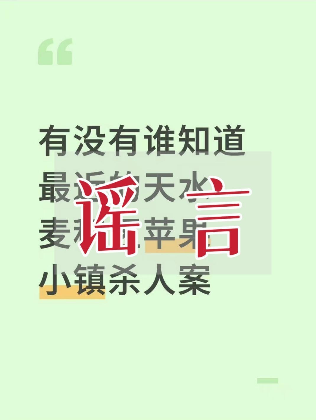 近日,有网民发布“麦积区苹果小镇学生被杀”“天水精神病杀人”“一男扮女装故意杀人犯流窜作案”等图文视频,引发网民关注,造成群众恐慌。