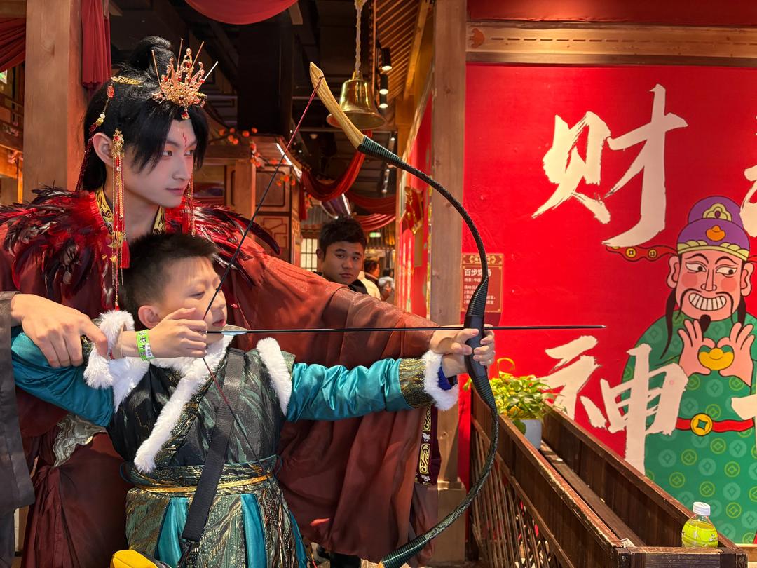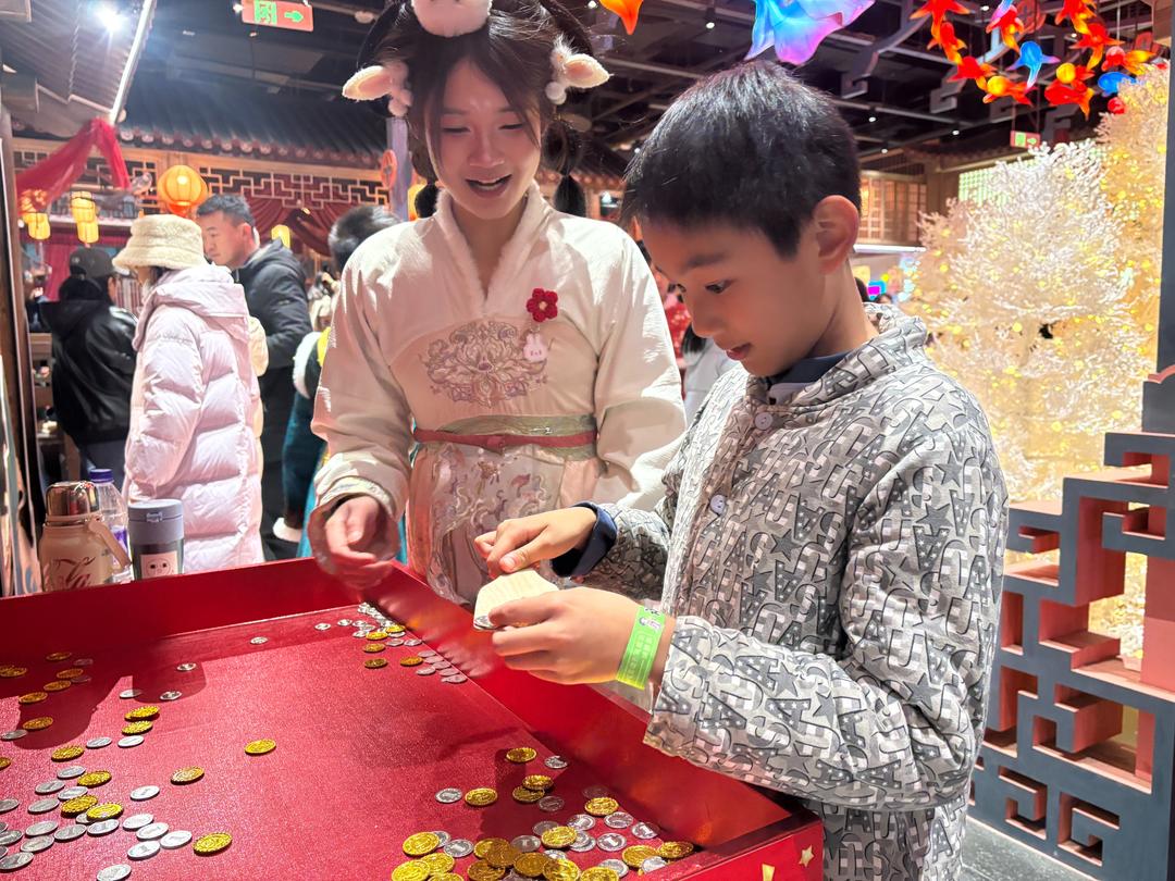 “飞雪对诗”摊位前,有唐诗宋词的经典对决,游客在答题之余,悄然解锁传统文化知识点;“五子棋擂台”上,老少玩家凝神对弈;在“捞金币”区,孩子们用特制网兜打捞金光闪闪的“古币”,笑声不断;而传统射箭项目则吸引了许多年轻人一试身手。