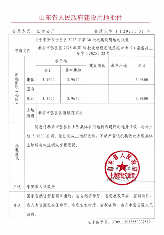 山东省人民政府以《关于泰安市岱岳区2025年第36批次建设用地的批复》(鲁政土字J〔2025〕56号)批准征收土地3.96公顷(本公告附件).