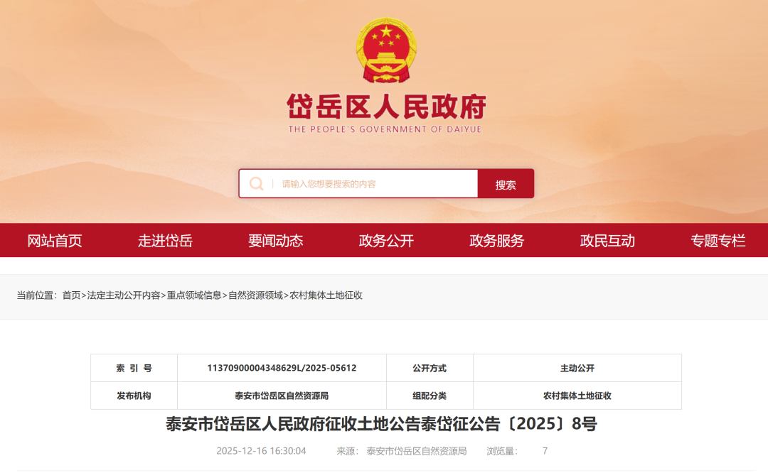 12月16日,岱岳区人民政府网站发布泰安市岱岳区人民政府征收土地公告泰岱征公告〔2025〕8号,详情如下: