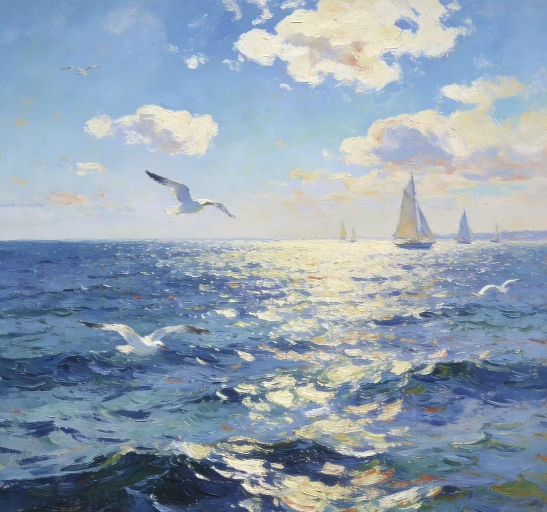 总之,海的壮阔与人的雄伟,共同造就了海洋油画兼容并包的气度与多元并生的样貌。无论外在技术媒介如何变换,艺术家们总能在关于历史和时代的思考中,缘情言志、信笔挥洒,创作出物我相融的精彩作品。