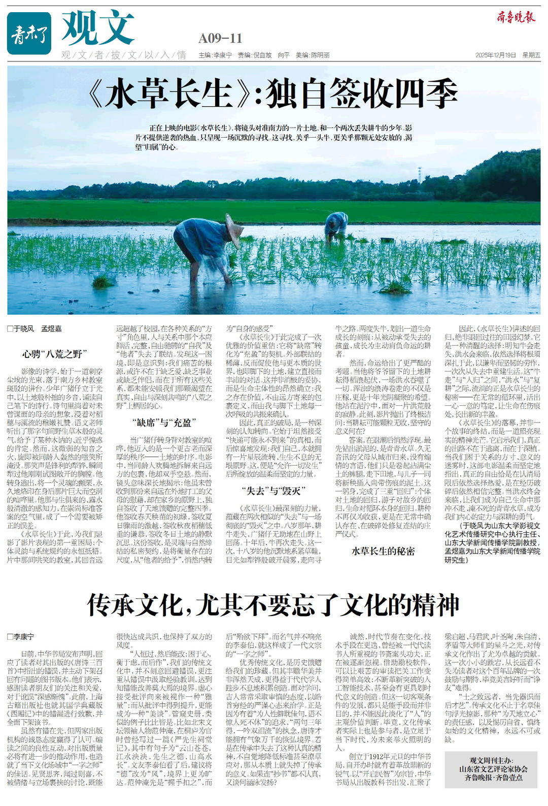 因此,《水草长生》讲述的回归,绝非退回过往的田园幻梦。它是一种清醒的选择:明知牛会走失,洪水会来临,依然选择将根须深扎于此,以谦卑而坚韧的劳作,一次次从失去中重建生活。这“牛走”与“人归”之间,“洪水”与“复耕”之际,流淌的正是水草长生的秘密——在无常的循环里,活出一心一意的笃定,让生命在伤痕处,长出新的丰盈。
