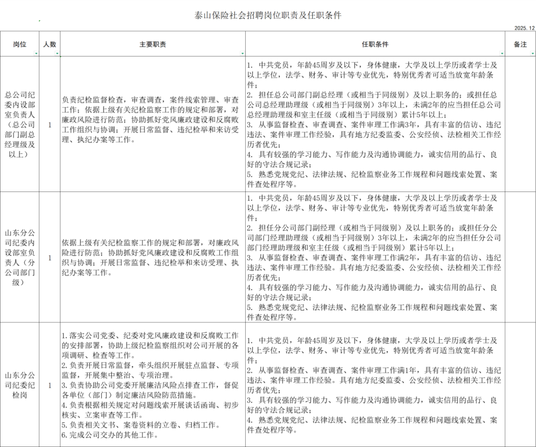 上述招聘岗位的主要职责、任职条件等详见《泰山保险社会招聘岗位及任职条件表》