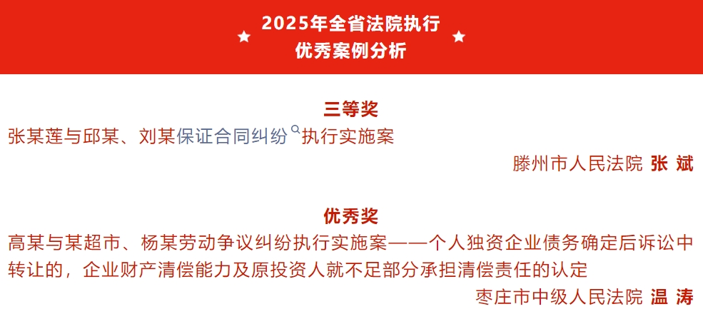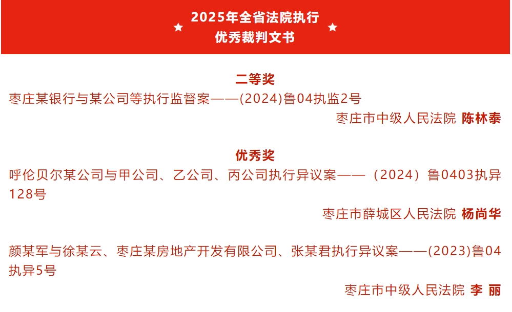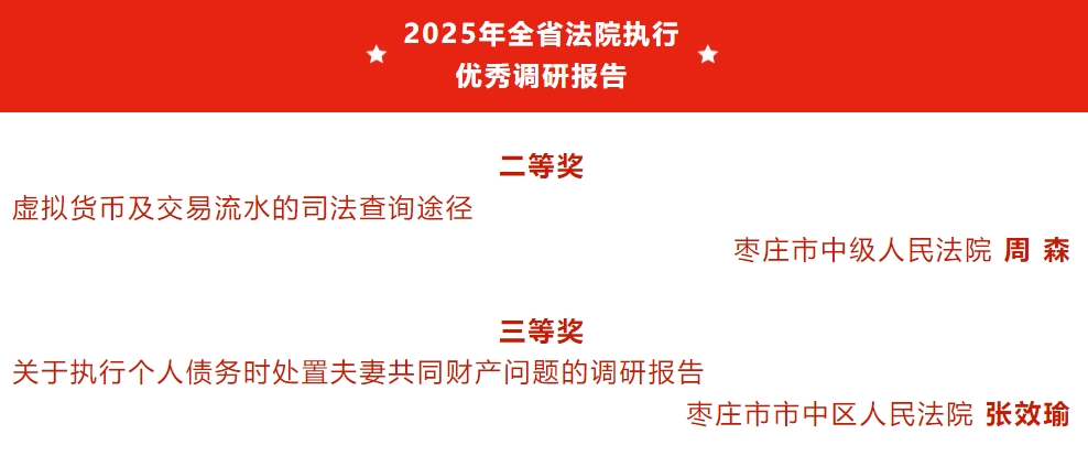 近日山东省高级人民法院下发了关于全省法院执行优秀裁判文书案例分析和调研报告评选活动获奖情况的通报枣庄法院干警撰写的3篇裁判文书2篇案例分析2篇调研报告获奖大众新闻记者孟令洋