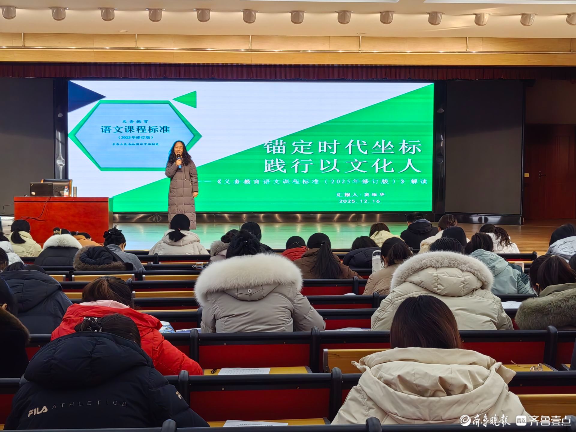 12月16日下午,东昌府区阳光小学开展《义务教育语文课程标准(2025年修订版)》落地实践教研活动。本次活动以“锚定时代坐标,践行以文化人——新课标视域下的语文教学变革与实践探索”为主题,特邀东昌府区张炉集中心学校窦维华老师作专题讲座。东昌府区阳光小学语文教研基地负责人陈义民及全体语文教师参与活动。