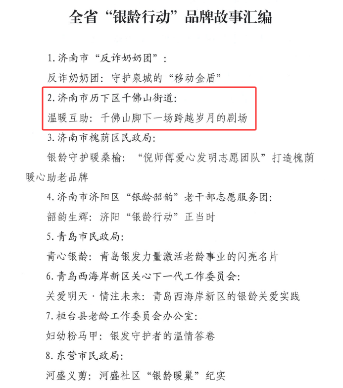 近日,山东省民政厅公布“银龄行动”创新案例和“银龄行动·品牌故事”名单,济南市历下区千佛山街道的《温暖互助:千佛山脚下一场跨越岁月的剧场》入选全省“银龄行动·品牌故事”,为构建老年友好社区提供了可复制、可借鉴的实践样本。