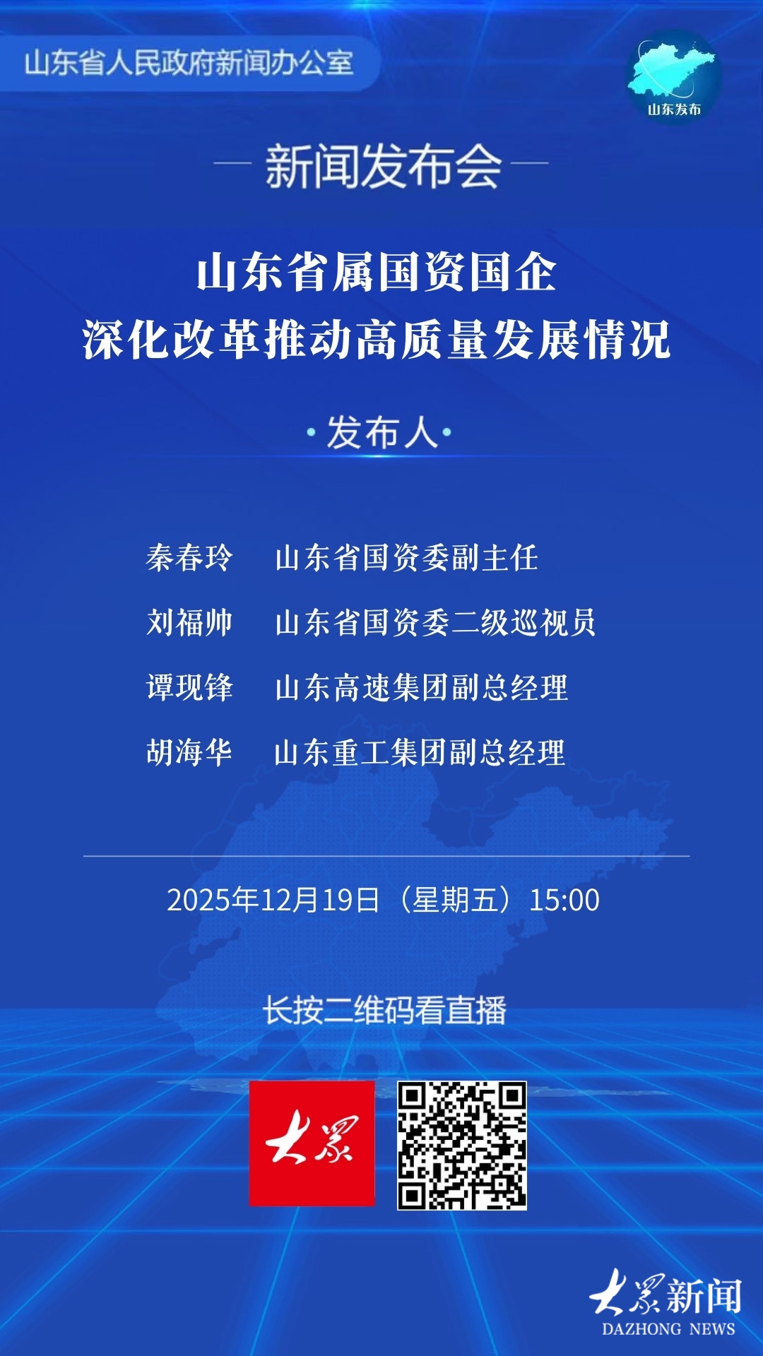 事关省属国资国企深化改革发展!今天下午3时山东省政府将举行新闻发布会大众新闻 崔晗 申家鑫 2025-12-19 14:04:01原创省政府新闻办定于12月19日(周五)下午3:00举行省政府新闻办新闻发布会,邀请省国资委负责同志等介绍山东省属国资国企深化改革推动高质量发展情况。(大众新闻记者 崔晗 申佳鑫)责任编辑:于春晖