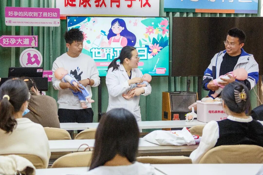在河南省商丘市睢县妇幼保健院孕妇课堂上,医护人员手把手教准妈妈、准爸爸如何护理新生儿宝宝。 新华社 徐泽源 摄