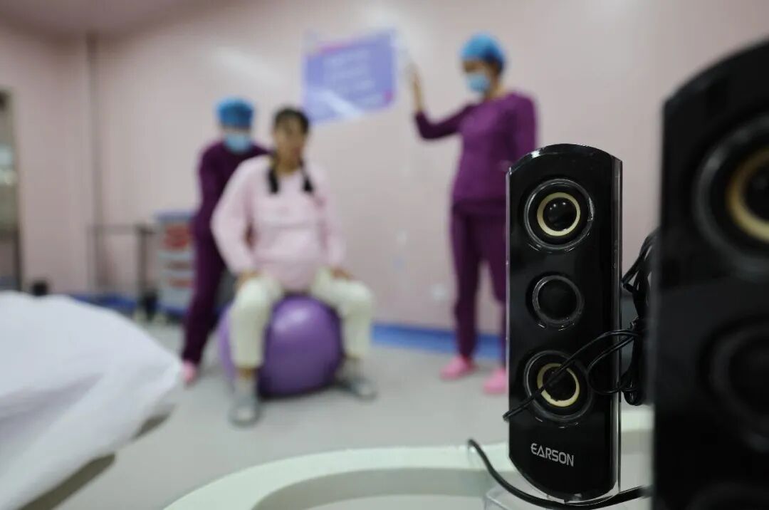 在山东省临沂市沂南县妇幼保健院产科病房,护士在对孕妇进行“导乐分娩”指导。 新华社 王彦冰 摄