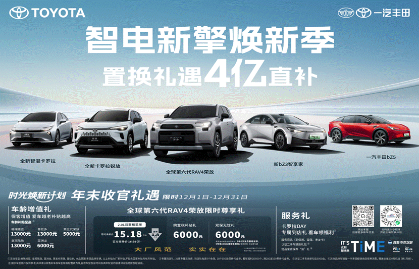 值得一提的是,12月1日-12月31日,为回馈用户厚爱,一汽丰田年末收官礼遇再升级,以4亿元厂家直补正式开启“智电新擎焕新季”。全球第六代RAV4荣放官方指导价为16.98万元的2.0L双擎精英版限时焕新价15.18万元,还可叠加享受6000元的置购税补贴礼和6000元的6年6次免费基础保养及6年或10万公里整车质保的双保无忧礼,不仅降低了用户的购车门槛,更周全地保障了后续用车生活,可谓是一次入手、长期受益。此外,皇冠陆放、格瑞维亚、普拉多等重磅车型可享至高1.3万元的车龄增值礼;更有卡罗拉DAY专属到店礼等服务礼遇,以极致诚意为用户创造最佳购车时机。