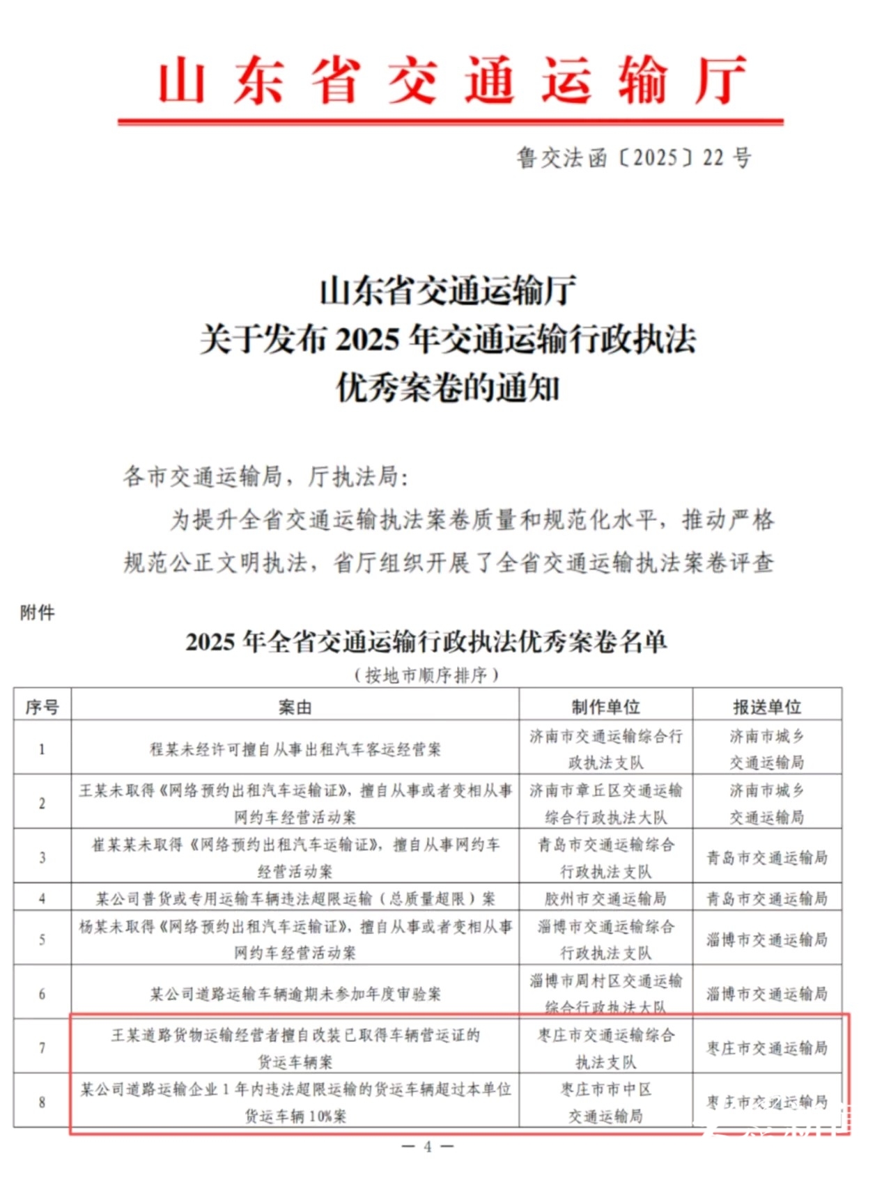近日,记者从山东省交通运输厅获悉,枣庄市交通运输综合执法支队办理的“王某道路货物运输经营者擅自改装已取得车辆营运证的货运车辆案”及推荐的“某公司道路运输企业1年内违法超限运输的货运车辆超过本单位货运车辆10%案”,凭借规范的执法程序、扎实的证据链条、严谨的文书制作,成功入选2025年全省交通运输行政执法优秀案卷,为全市交通运输执法工作再添亮眼成绩单。