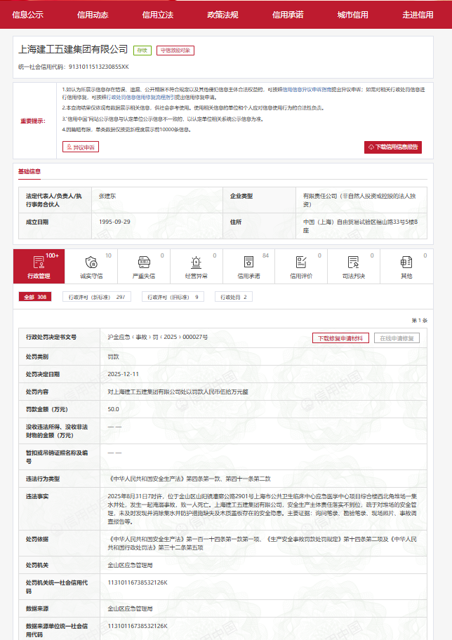 近日,齐鲁晚报·齐鲁壹点记者从信用中国获悉,上海建工五建集团有限公司因违反《中华人民共和国安全生产法》第四条第一款、第四十一条第二款,被金山区应急管理局罚款50万元。