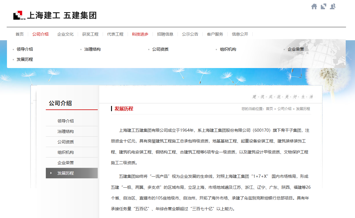 上海建工五建集团有限公司成立于1964年,系上海建工集团股份有限公司(600170)旗下骨干子集团,注册资金十亿元。