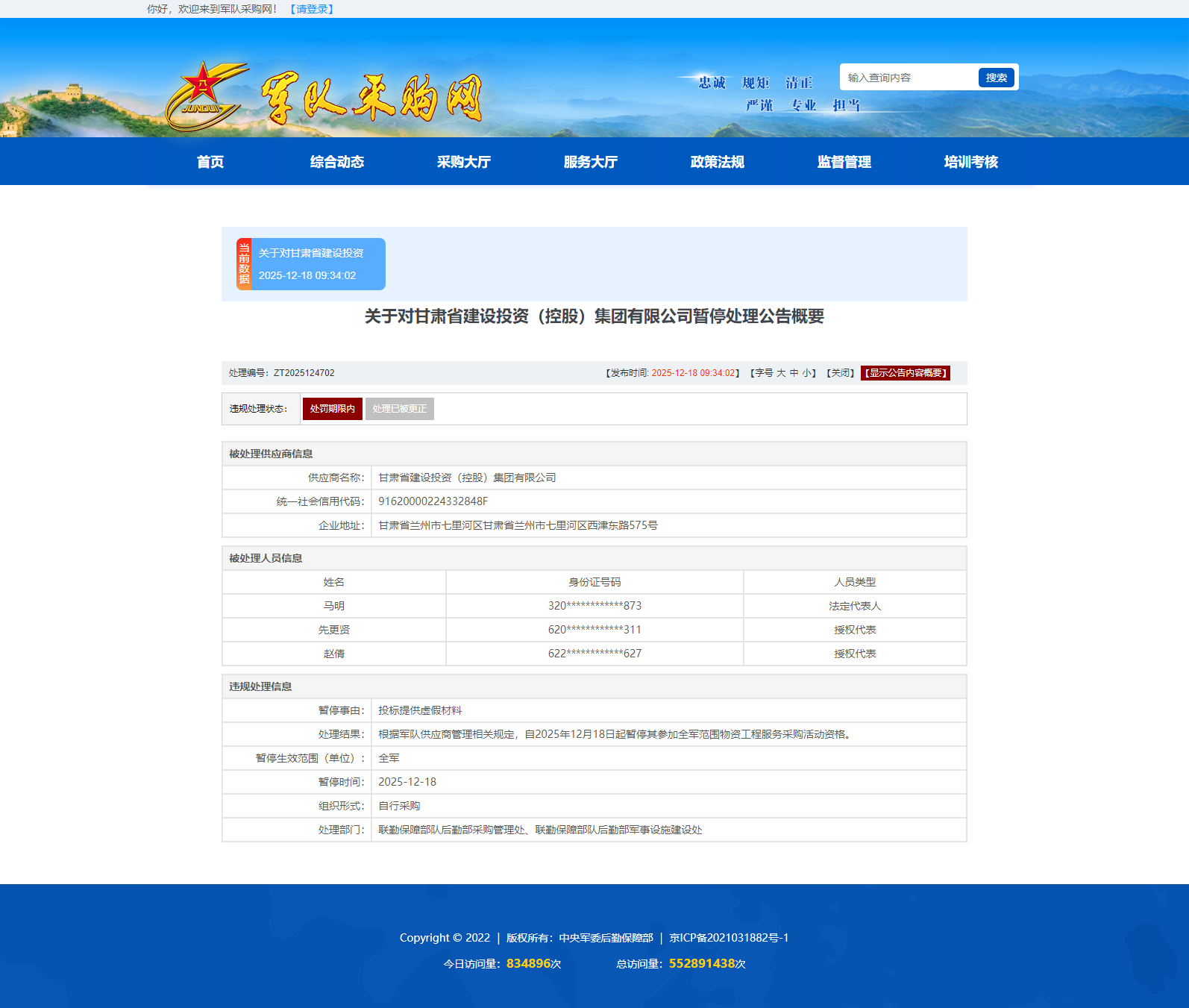 依据规定,处理部门决定对其作出严肃处理:自2025年12月18日起,暂停甘肃省建设投资(控股)集团有限公司参加全军范围内物资、工程、服务采购活动的资格。该处理适用于全军所有单位,且明确其“组织形式”为自行采购范畴。
