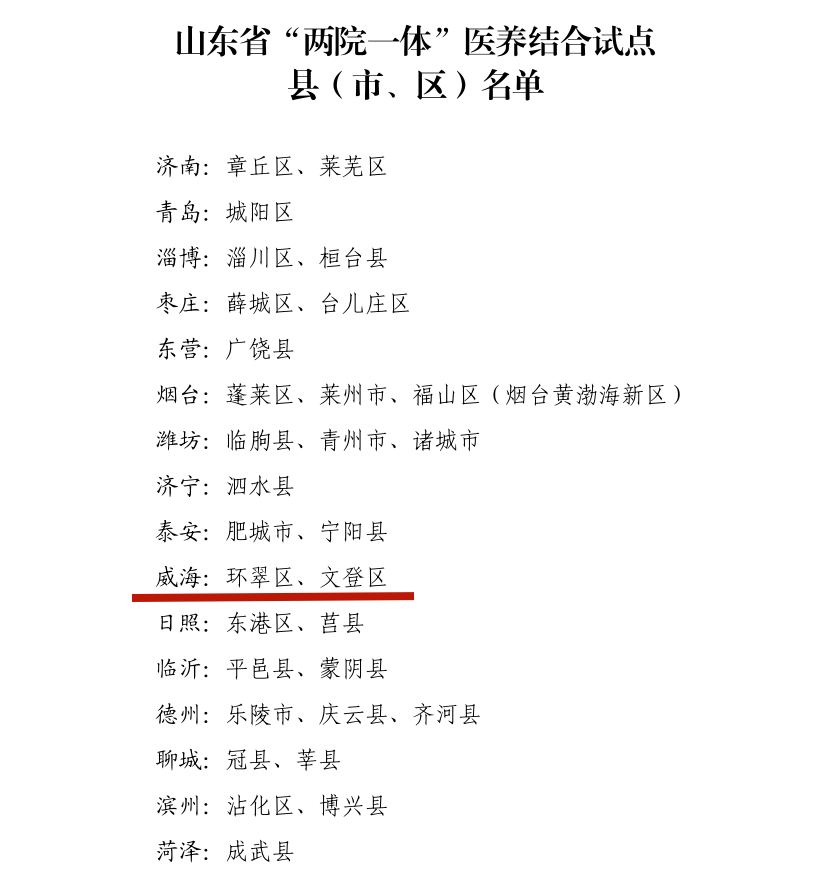 威海2个!山东省“两院一体”医养结合试点县(市、区)名单出炉!大众新闻·大众日报 2025-12-19 18:03:55原创近日省卫生健康委公布山东省“两院一体”医养结合试点县(市、区)名单威海市环翠区、文登区 成功入选↓↓↓(大众新闻记者 郑莉 见习记者 董雨喆)责任编辑:郑莉