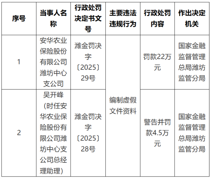 12月16日,国家金融监督管理总局山东监管局官网公示的行政处罚决定书显示,安华农业保险股份有限公司潍坊中心支公司因为编制虚假文件资料被罚款22万元。同时,吴开峰(时任安华农业保险股份有限公司潍坊中心支公司总经理助理)被警告并罚款4.5万元。