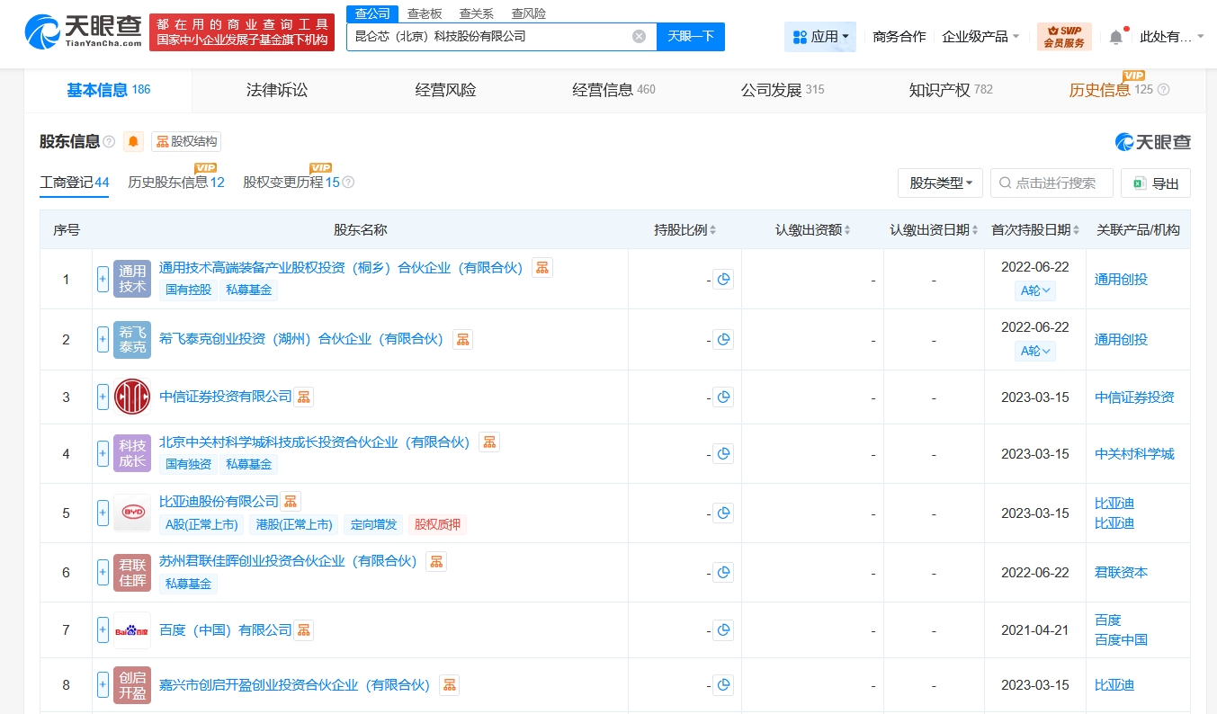 昆仑芯(北京)科技股份有限公司成立于2011年6月,法定代表人为欧阳剑,经营范围含计算机系统服务、基础软件服务、应用软件服务、数据处理、产品设计、模型设计、经济贸易咨询、企业管理咨询等。股东信息显示,该公司由百度(中国)有限公司、通用技术高端装备产业股权投资(桐乡)合伙企业(有限合伙)、比亚迪等共同持股。