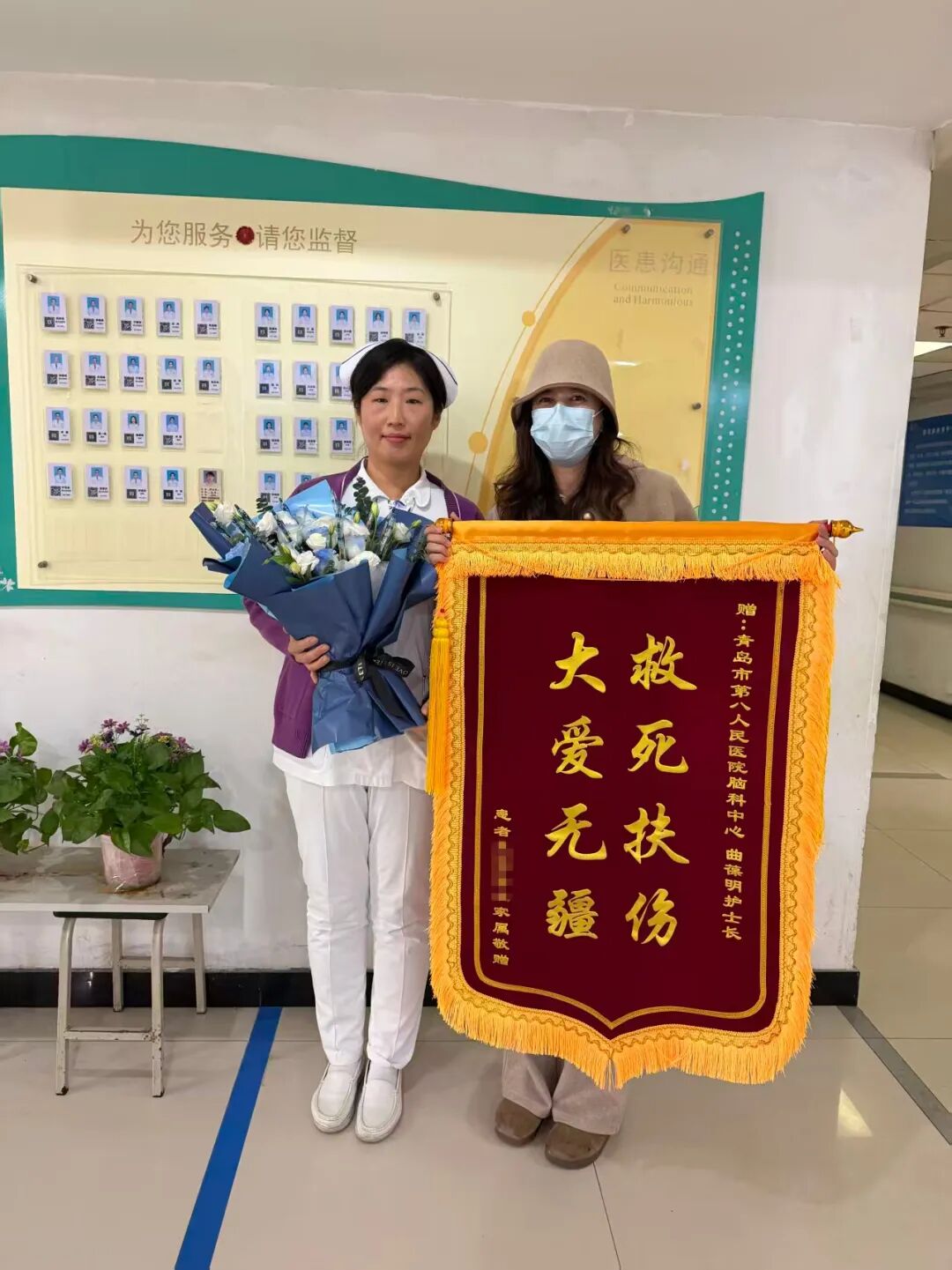 为表达对重生之恩的无限感激,患者家属特别为挺身救人的第一棒——曲葆明护士长送来了锦旗与鲜花。这份深深的谢意,是对这场生命接力付出的最高肯定。