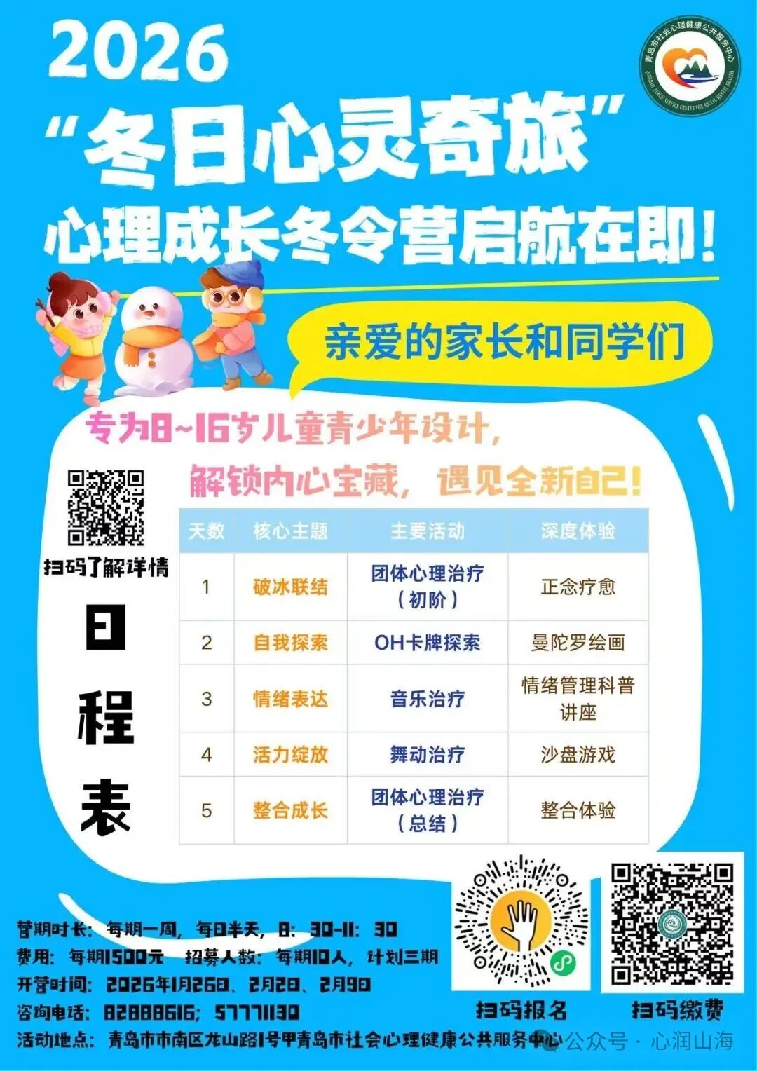 青岛市社会心理健康公共服务中心2026年“冬日心灵奇旅”儿童青少年心理成长冬令营开始报名啦!寒假是一段宝贵的调整期,也是放松身心的好机会。“张而不弛,文武弗能也;弛而不张,文武弗为也”。在张弛之间,为孩子们打造一座专属的幸福体验馆。今年冬日,青岛市社会心理健康公共服务中心诚邀8-16岁的孩子踏上为期一周的 “心灵奇旅”。