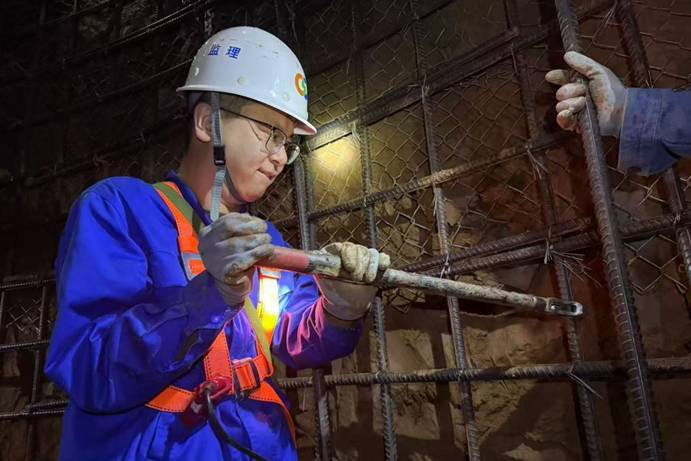 12月14日晚7点半,杨家坪主井井筒228-232米段钢筋绑扎完成,施工方申请验收。随即,该公司生产技术部业务负责人王海均便带领监理单位、施工单位代表共同下井验收。在验收中,王海均发现井筒东侧一根环向钢筋的接头搭接位置与喷漆标记有误差,实测搭接长度为850mm,与“搭接长度≥35d(875mm)”标准不符,在三方共同见证下,施工人员立即进行现场整改。经复验合格,该段才被允许进入混凝土浇筑工序。