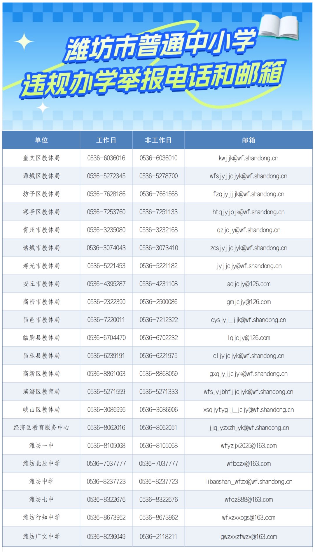 为保障学生合法休息权益,持续推进规范管理,现将潍坊市普通中小学违规办学举报电话及邮箱予以公布,各地中小学校如存在假期违规加班补课等情况可拨打相关电话进行反映。