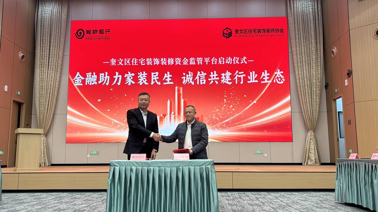仪式现场,潍坊银行与奎文区住宅装饰装修协会签订合作协议,为监管平台的长效运营筑牢合作基础,奎文区住宅装饰装修资金监管平台正式上线启用。