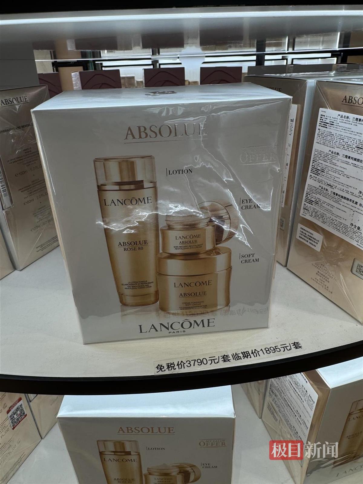 在一款包含水、乳、精华的护肤套装前,标签显示免税价为3790元,而临期价仅为1895元。产品包装上标注的限制使用日期为“2026年4月”。此外,多款口红也设有临期价格,其中最优惠的一款原免税价280元,现仅售140元,同样相当于半价。
