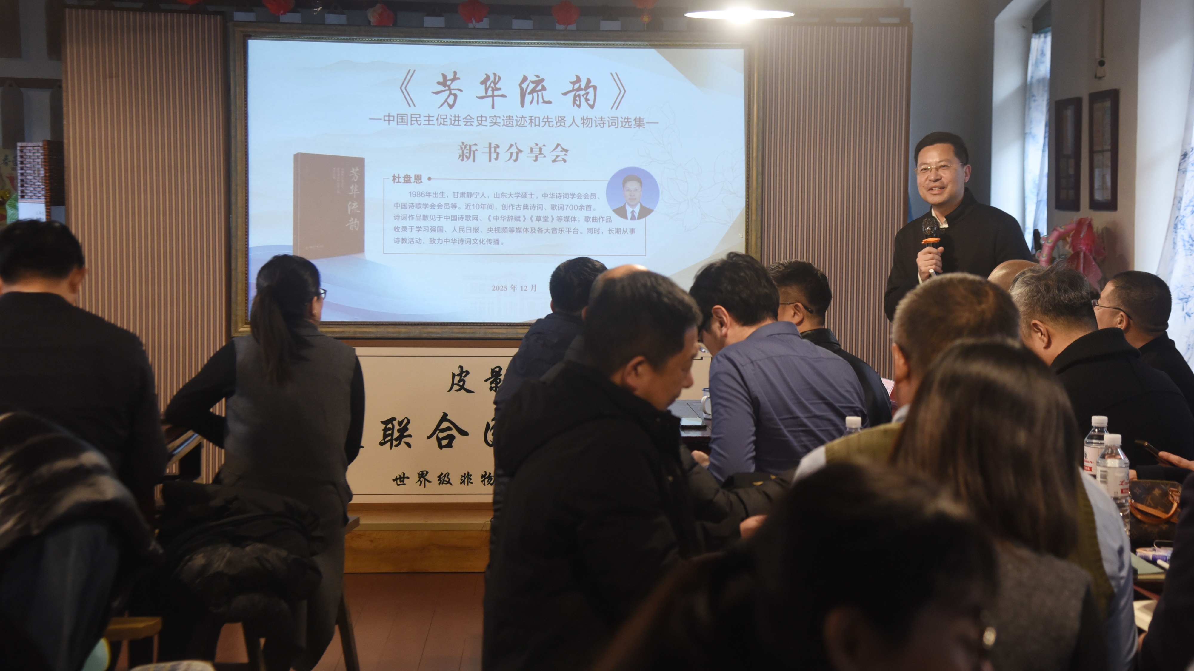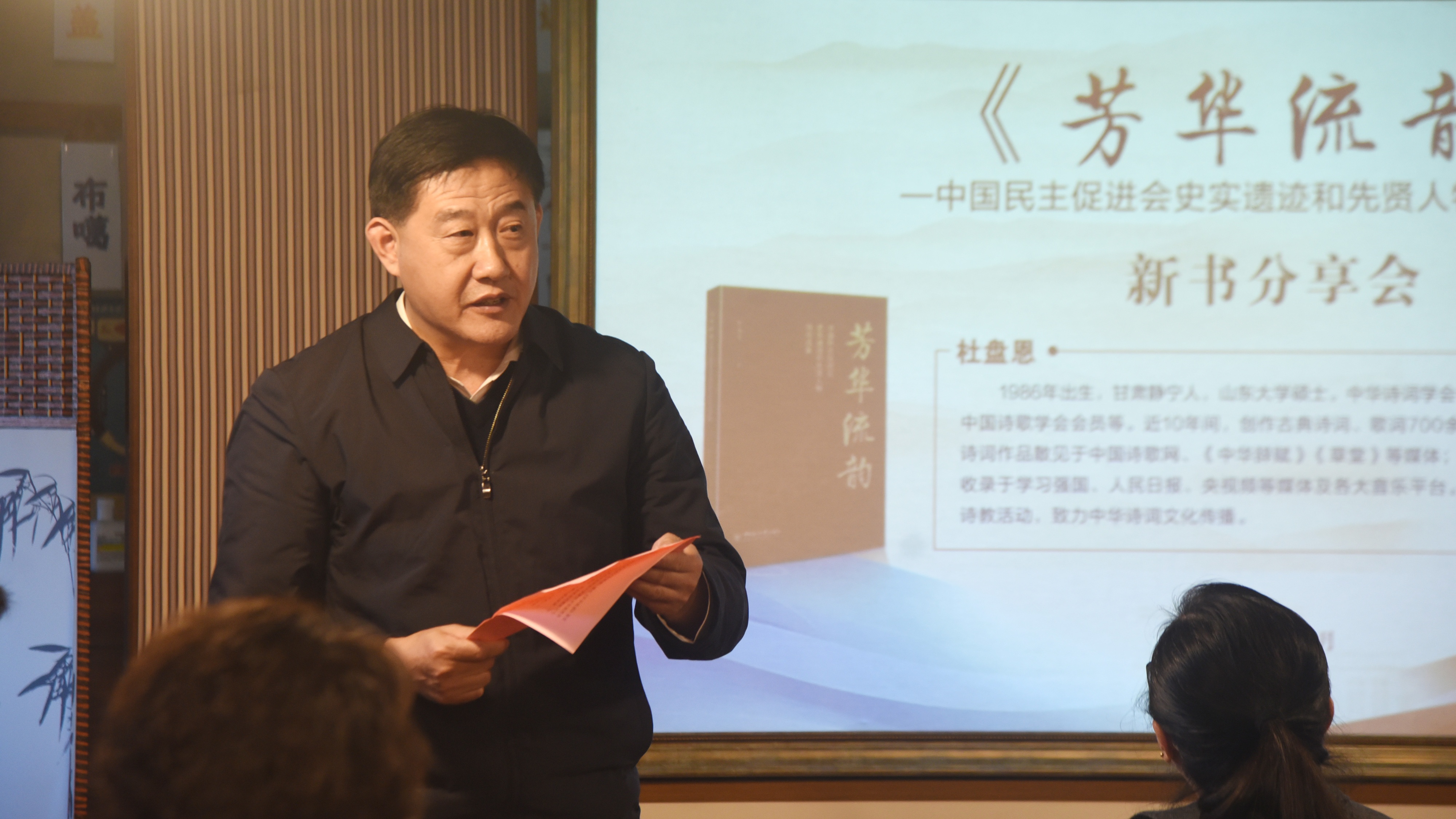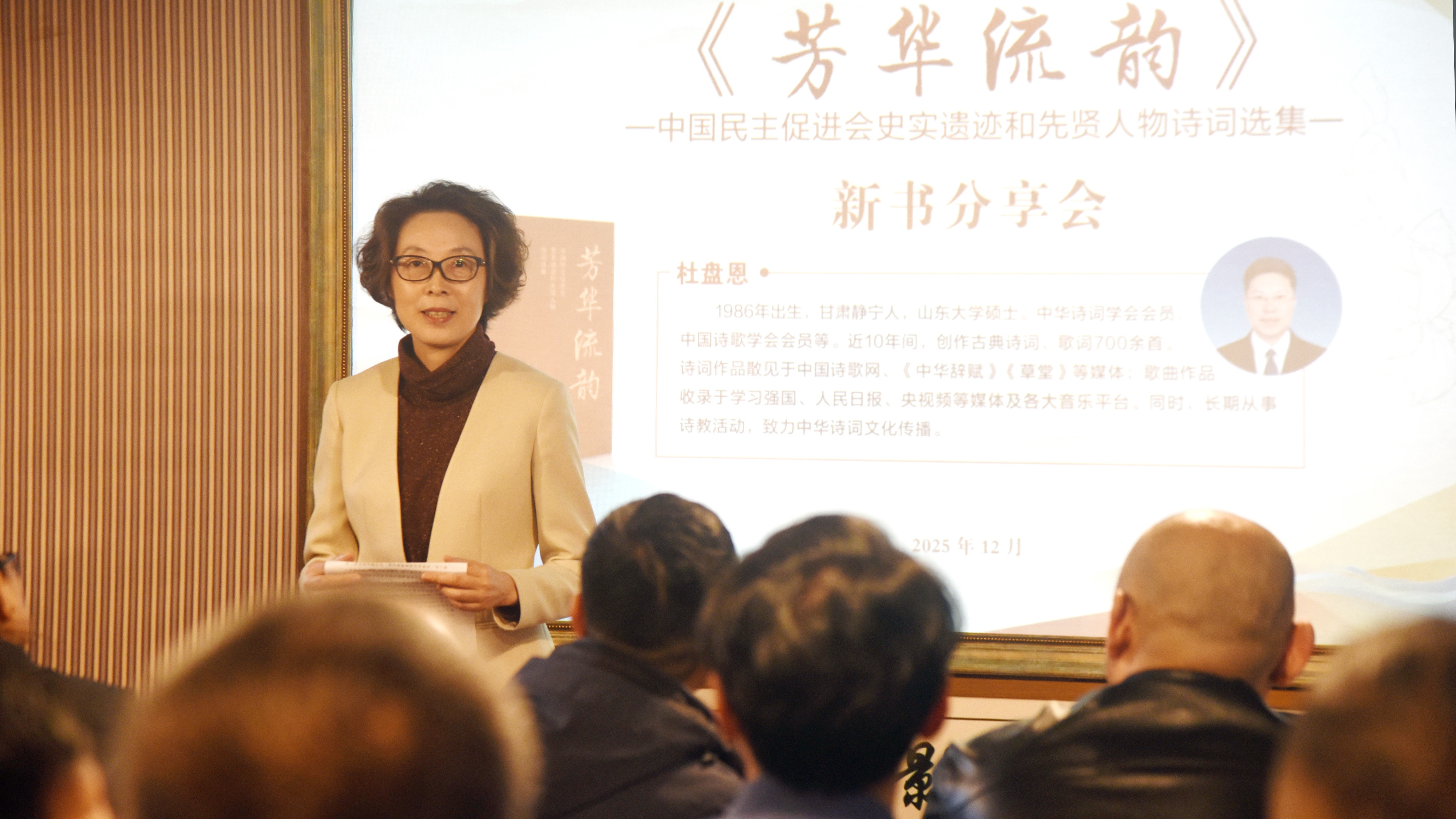 作者杜盘恩随后作《诗说民进会史》主题分享,深入解读了该诗集的创作背景与历史内涵,通过诗词艺术再现民进先贤的奋斗历程与精神风貌,为理解多党合作历史提供了生动素材。